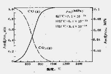 即 碳的直接氧化,即石墨在高溫下由于與空氣(O2)、水蒸汽(H2O)和碳酸氣等共存而被氧化。石墨在560℃以上就開始顯著氧化而使含碳制品脫碳損耗,由 圖可以看出右邊部分已被氧化成為脫碳區(qū),在脫碳區(qū)中由于碳的氧化而形成了許多擴(kuò)散通道,氧氣和熔渣通過擴(kuò)散通道進(jìn)入磚內(nèi),在界面處和碳反應(yīng),反應(yīng)產(chǎn)物通過 擴(kuò)散通道擴(kuò)散出去。由下圖可以看出在1000℃時(shí),系統(tǒng)中主要以CO氣體形式存在,Pco≈0.1Mpa,生成的CO氣體向外擴(kuò)散,阻止了O2及其它氣體 的進(jìn)入,從而起到氣態(tài)“抗氧化劑”效果,所以碳是能夠穩(wěn)定存在的,但出鋼后冷卻過程中有可能被空氣氧化。同時(shí)含碳制品襯磚表面上附有渣層,可防止由空氣引 起碳的氧化,起到保護(hù)膜的作用,這種保護(hù)作用在1000℃以上特別明顯。